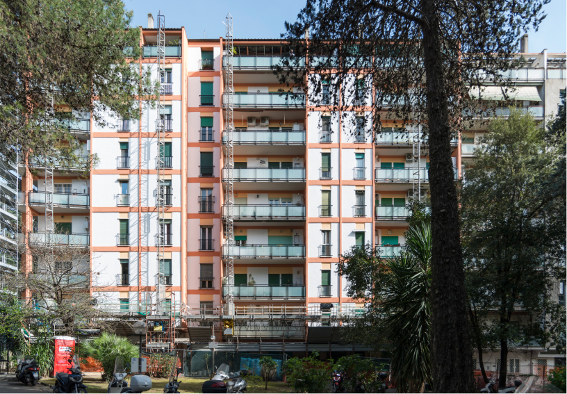 Il supercondominio di via Monte Cervialto 62, situato nella zona di Val Melaina, è un complesso residenziale formato da diversi edifici costruiti negli anni ‘70 del secolo scorso. Gli edifici, tutti di nove piani, presentano una struttura puntiforme in cemento armato, evidenziata dalle facciate con una distintiva bicromia bianco-arancio, che conferisce loro un carattere preciso. L’intervento ha riguardato solo parte del supercondominio, in particolare le scale C e D.