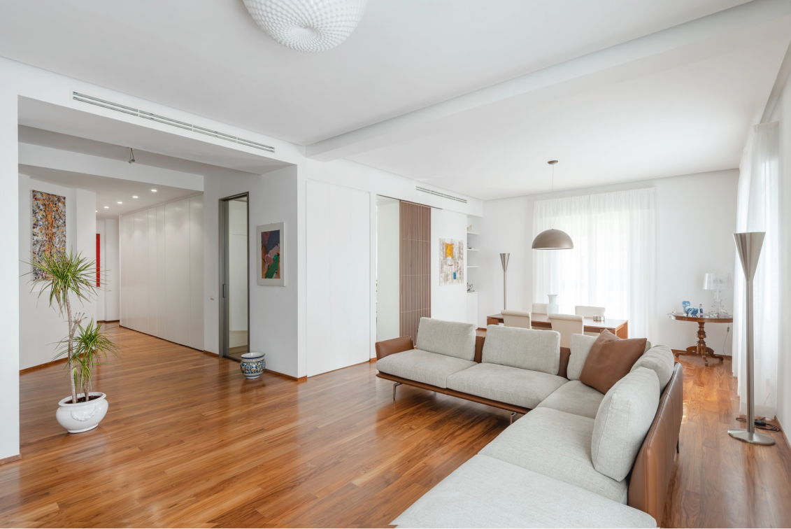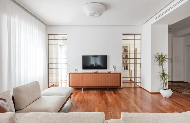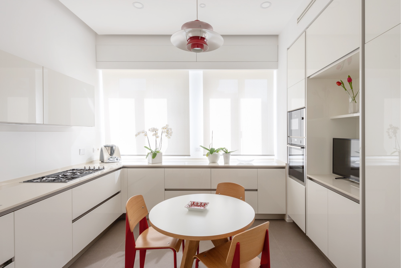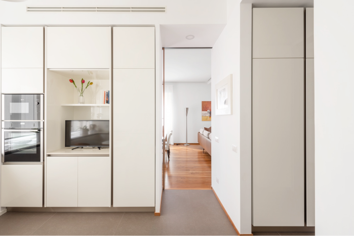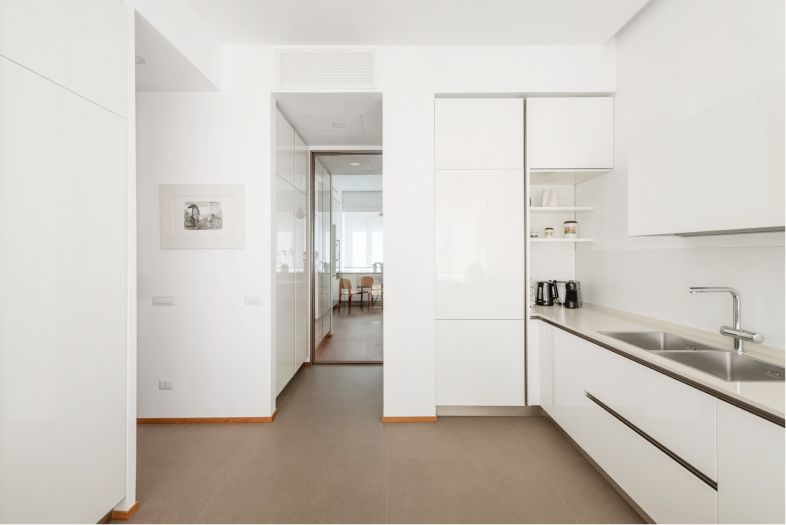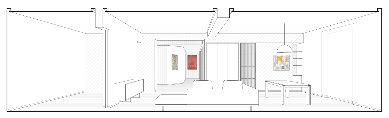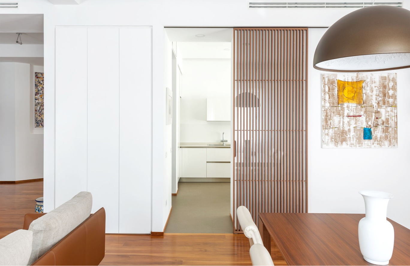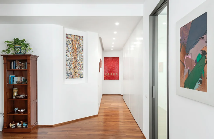 Il corridoio, snodo dell’appartamento tra la zona giorno e la zona notte, sviluppa su uno dei lati dell’armadiature a muro in falegnameria che scompaiono nel prospetto e dall’altro lato è caratterizzato da opere d’arte, già di proprietà della committenza e da mattoni circolari di vetrocemento