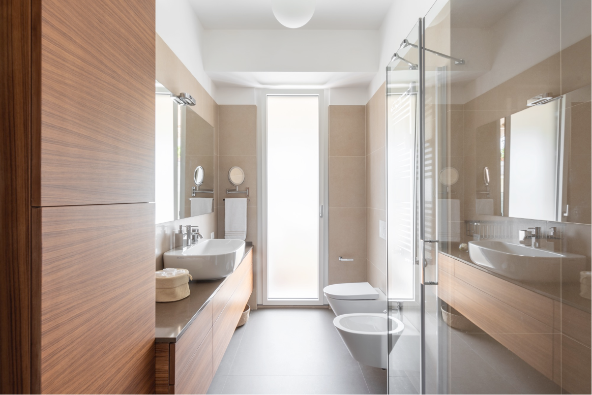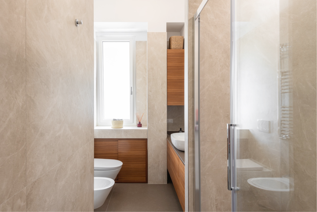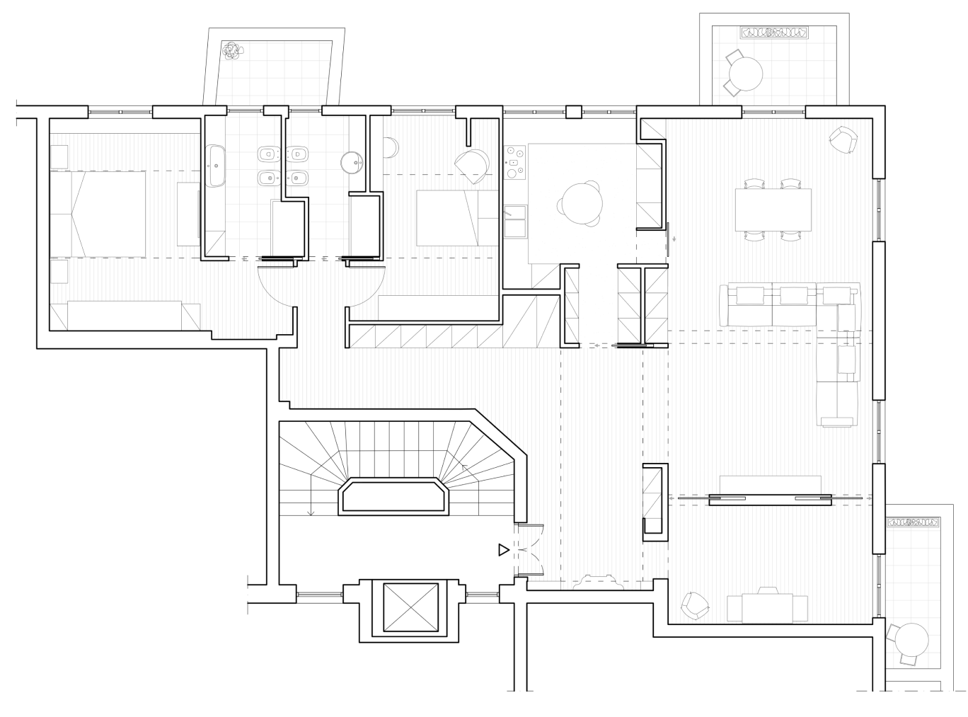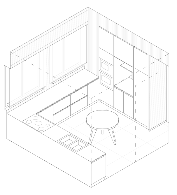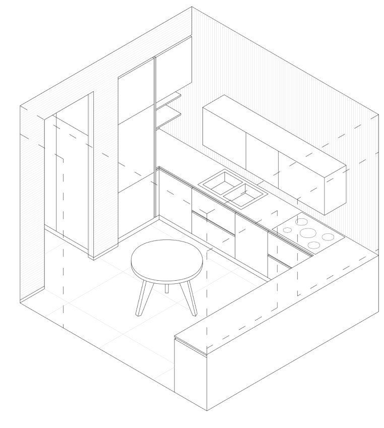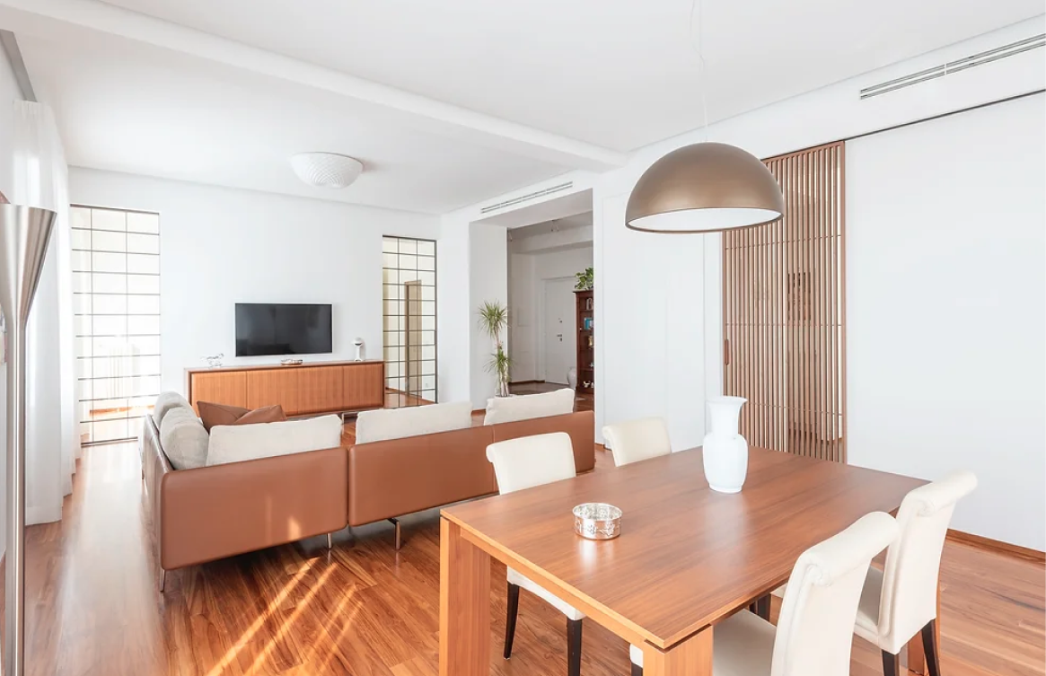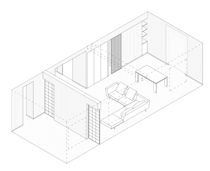 Il corridoio, snodo dell’appartamento tra la zona giorno e la zona notte, sviluppa su uno dei lati dell’armadiature a muro in falegnameria che scompaiono nel prospetto e dall’altro lato è caratterizzato da opere d’arte, già di proprietà della committenza e da mattoni circolari di vetrocemento