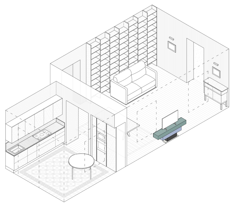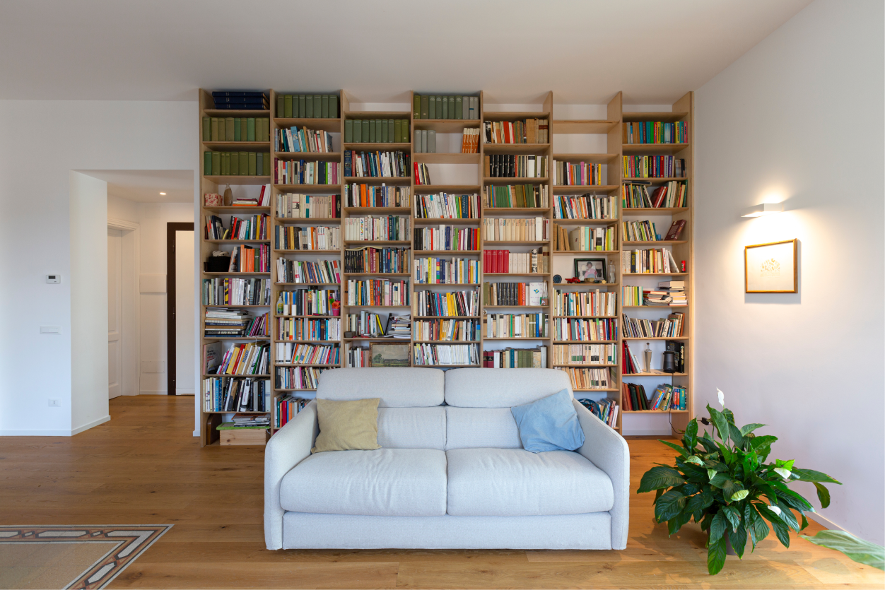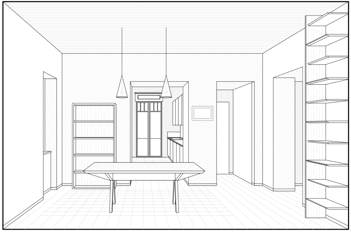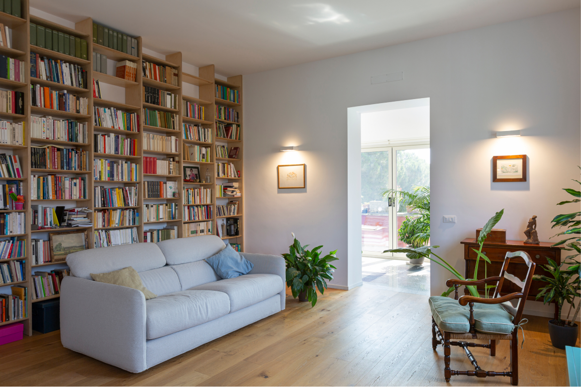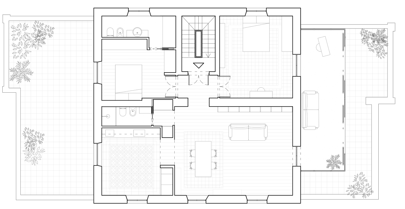 Il progetto ha stravolto la distribuzione originaria, creando una zona giorno esposta a sud che collegasse le due terrazze nel soggiorno, con le finestre laterali affacciate sul quartiere e i punti di fuga longitudinali delle due terrazze sul verde del parco