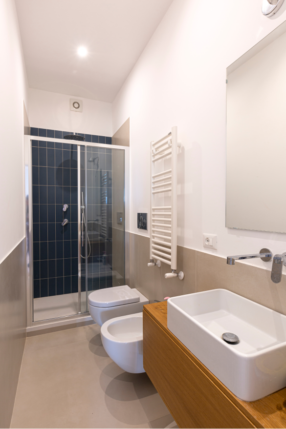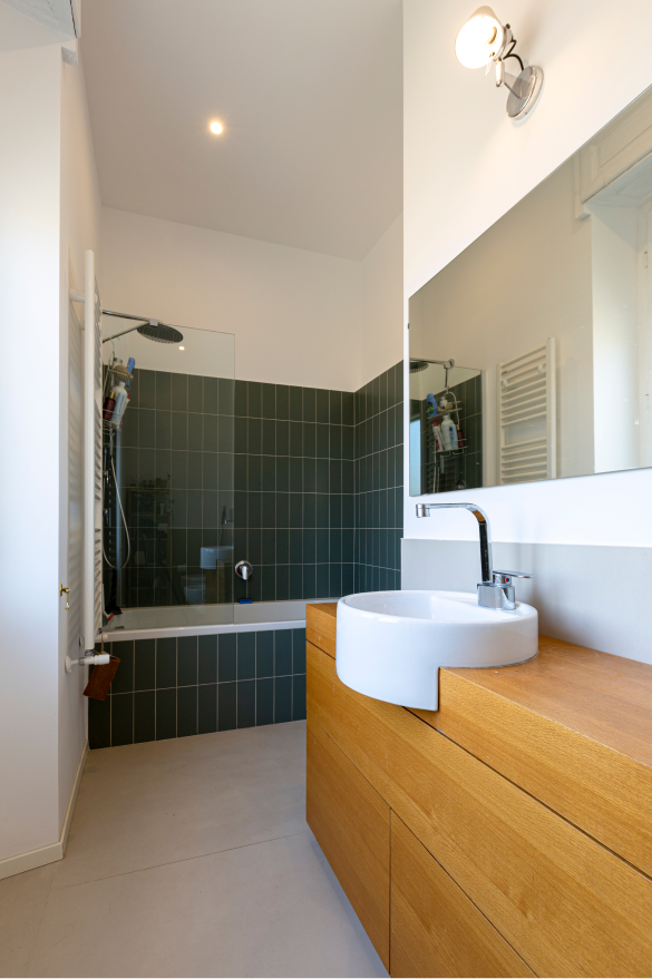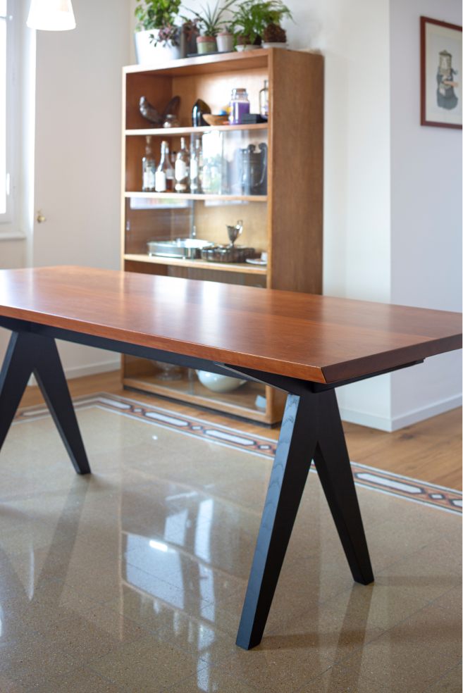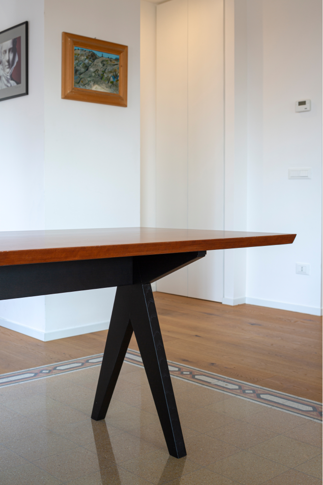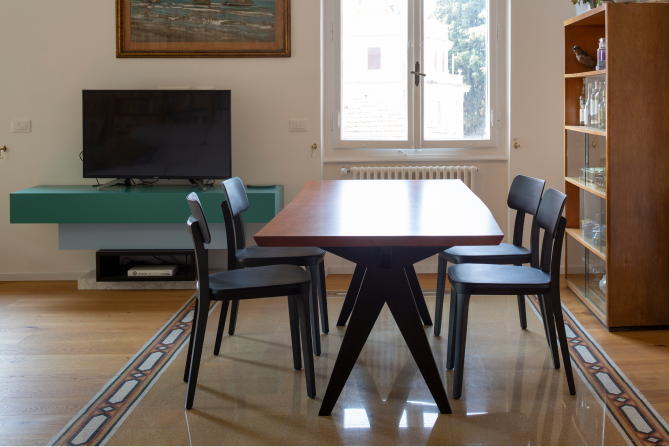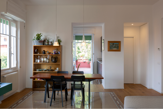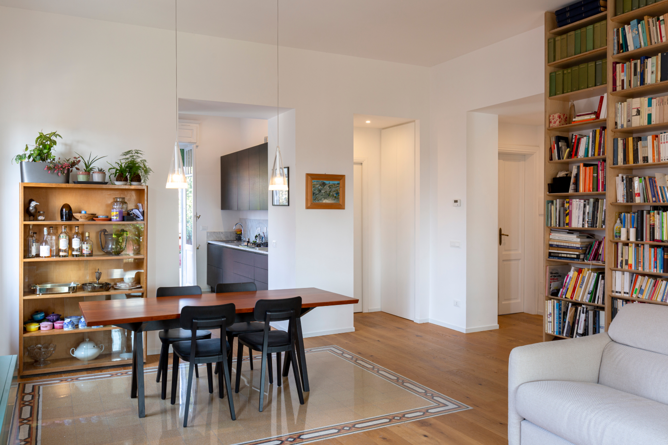 Durante le demolizioni altre aree con pavimenti di pregio sono riemersi e sono stati restaurati e mantenuti come incursioni cromatiche uno di questi è stato adattato per accogliere il tavolo da pranzo, un fratino in rovere e ciliegio massello su disegno