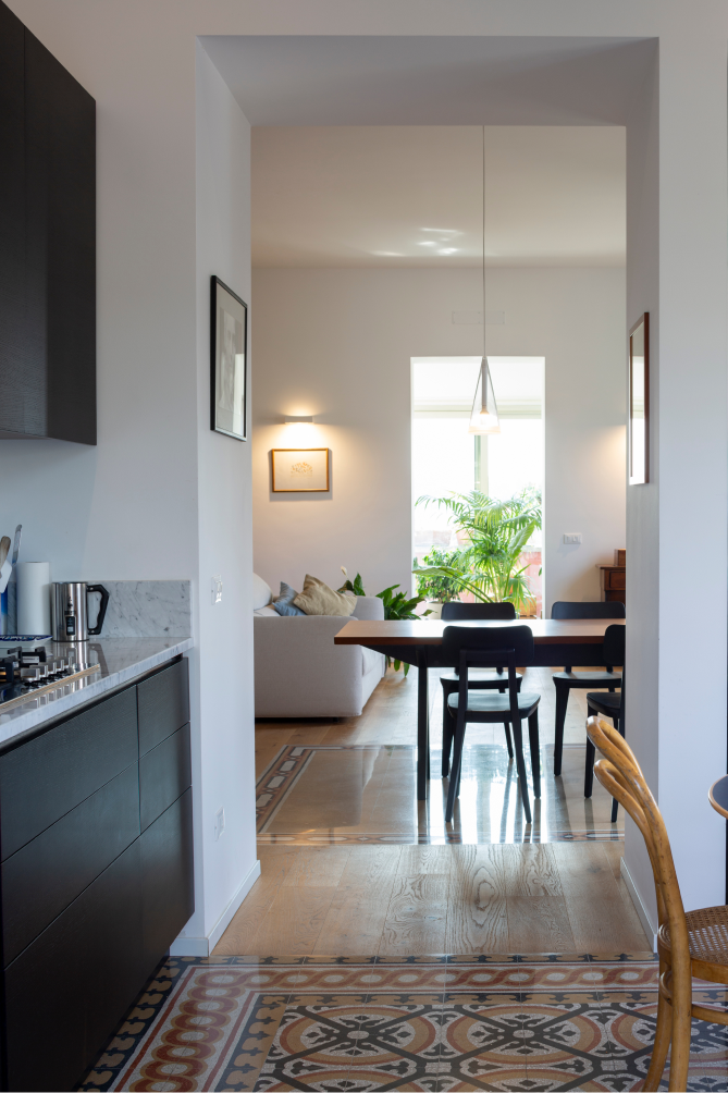 Lo spazio si muove con un doppio ritmo, interno e esterno la cucina ha preso il posto del vecchio salotto, per conservare il pavimento origianale su disegno