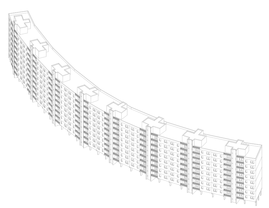 L’edificio a pianta semicircolare, oggetto di un piano di zona di fine anni ’80, era stato realizzato con la tecnologia dei pannelli prefabbricati in calcestruzzo gettati a pie d’opera. Tale tecnica costruttiva ha generato condensa e infiltrazione trai giunti degli stessi pannelli, più volte sigillati.