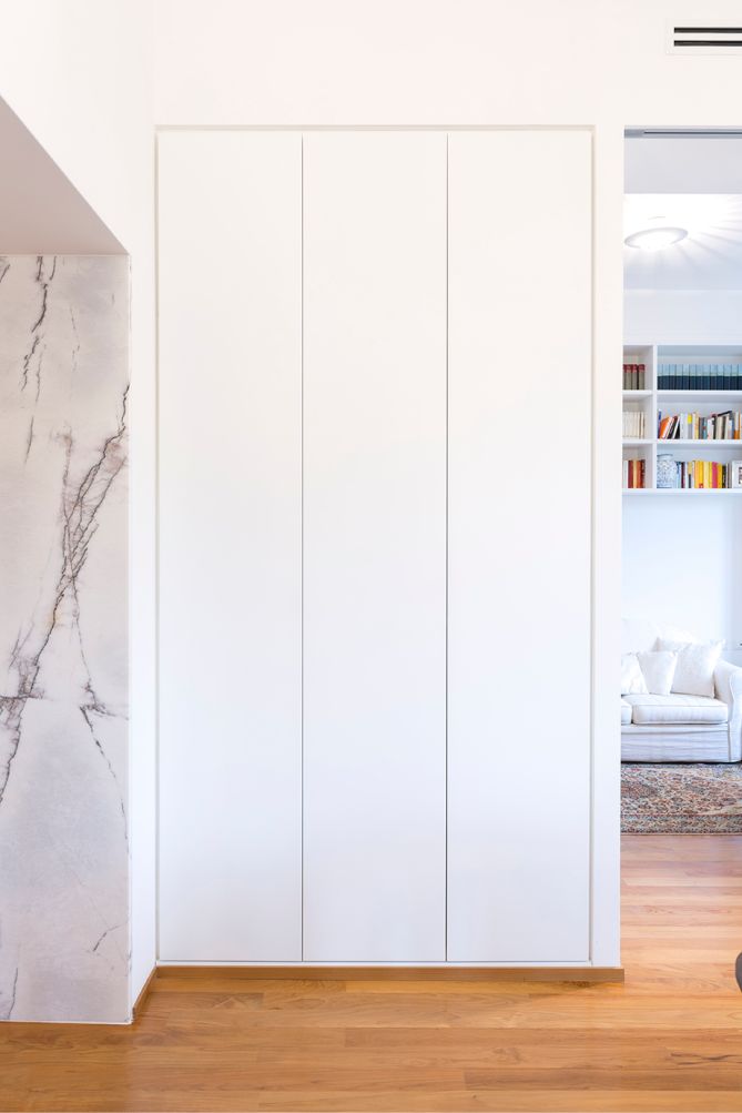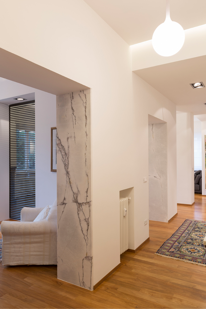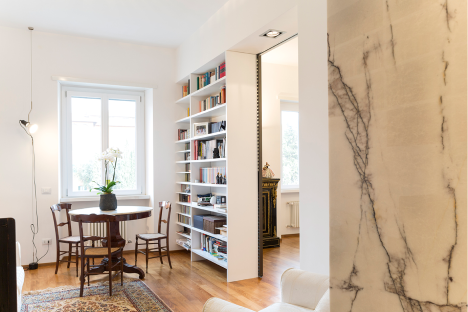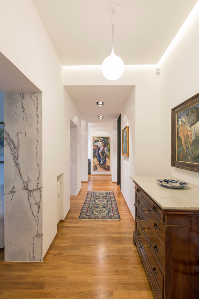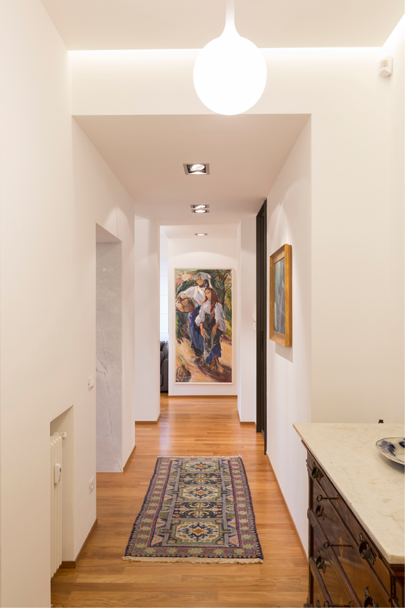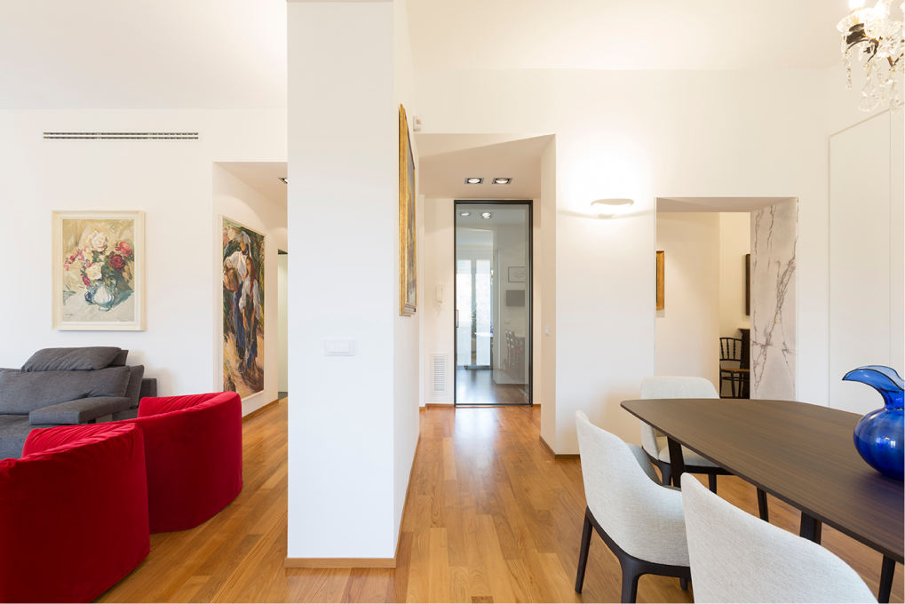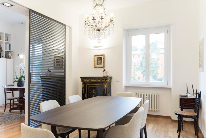 Si è curata in particolare la relazione tra gli oggetti d’antiquariato, le opere d’arte, i lampadari e gli arredi provenienti dalla casa padronale e i nuovi arredi come il tavolo in legno massello, le poltrone con braccioli in tessuto e le porte in alluminio e vetro