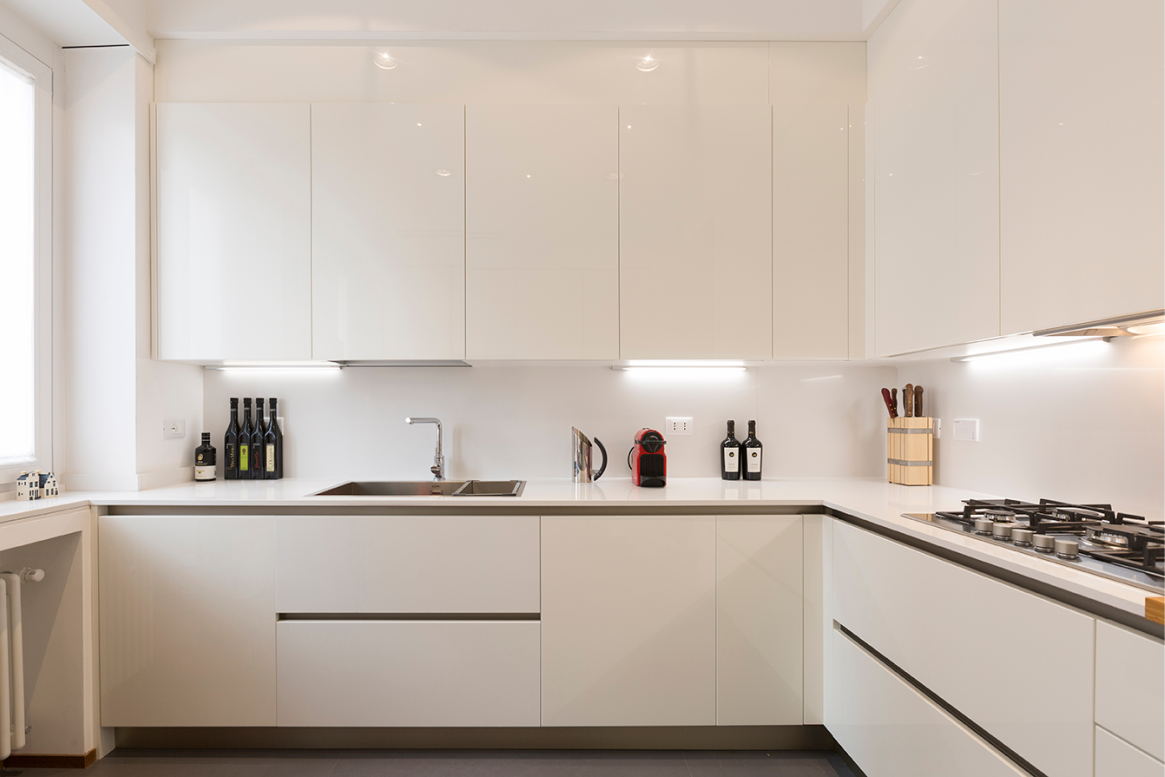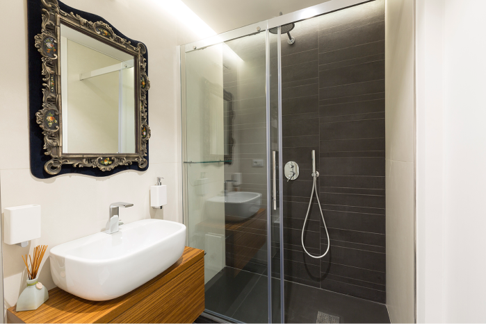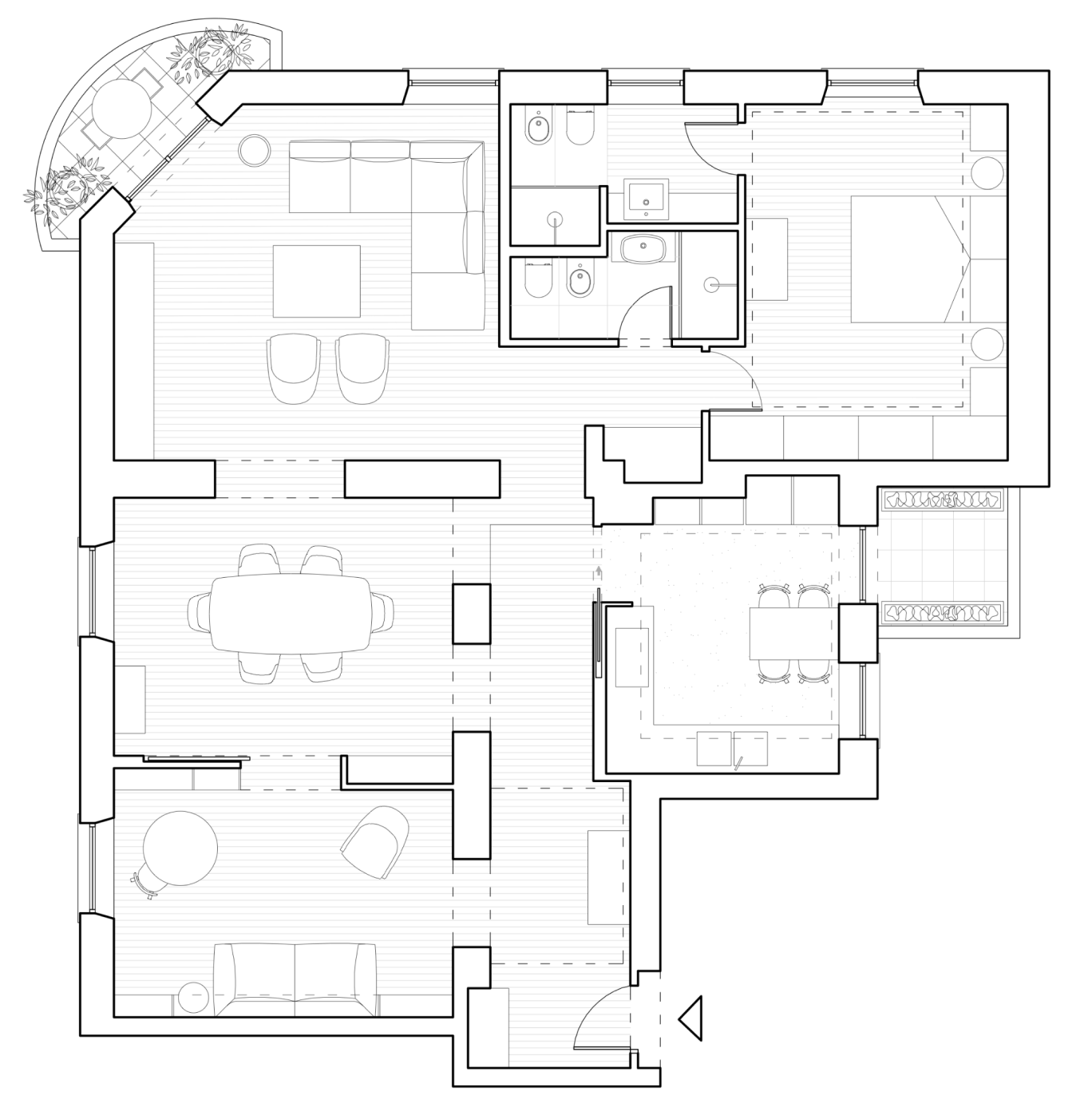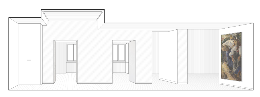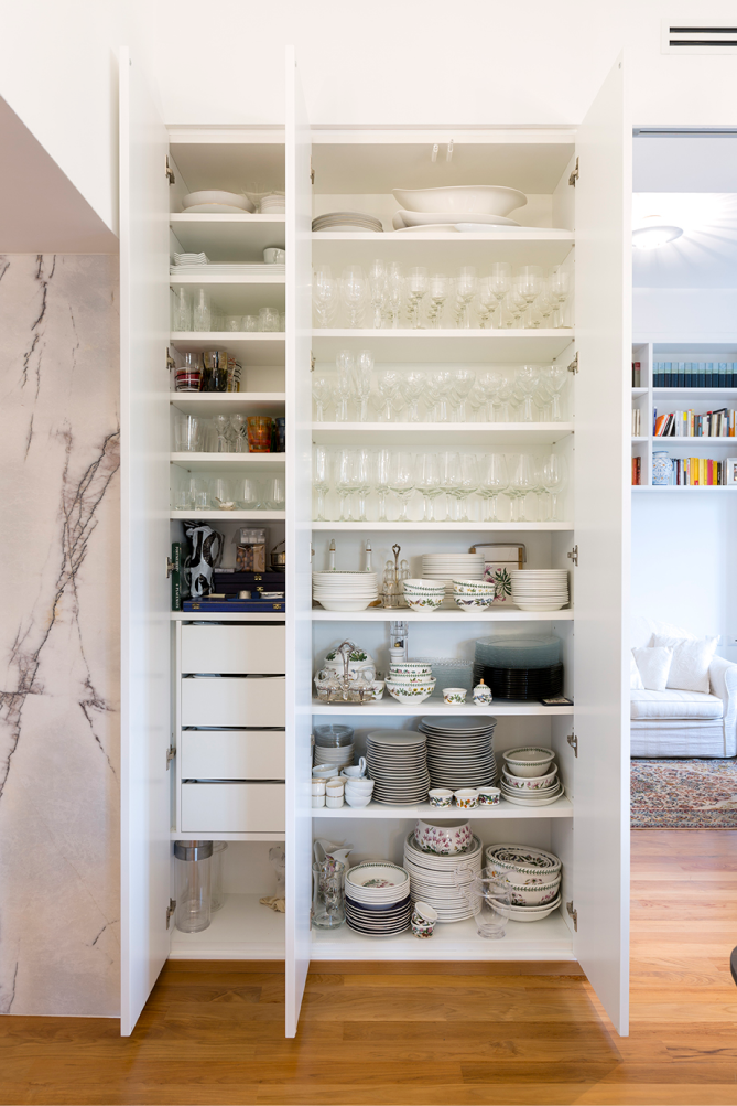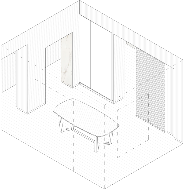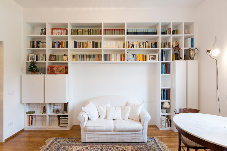 Si è curata in particolare la relazione tra gli oggetti d’antiquariato, le opere d’arte, i lampadari e gli arredi provenienti dalla casa padronale e i nuovi arredi come il tavolo in legno massello, le poltrone con braccioli in tessuto e le porte in alluminio e vetro