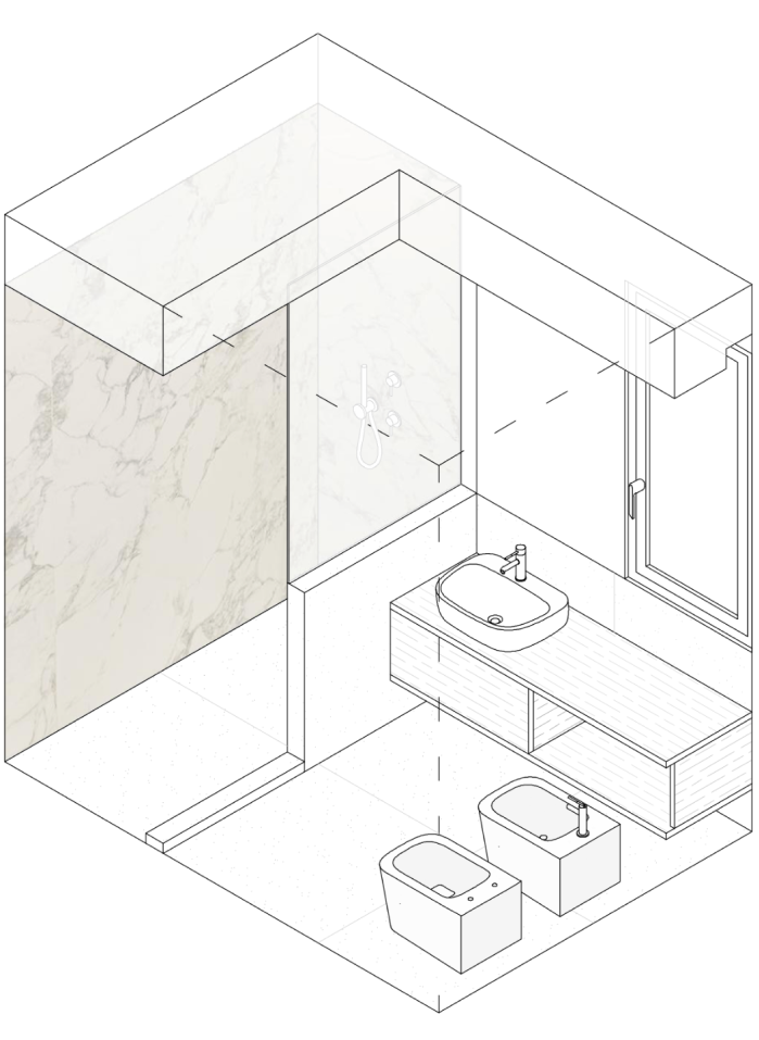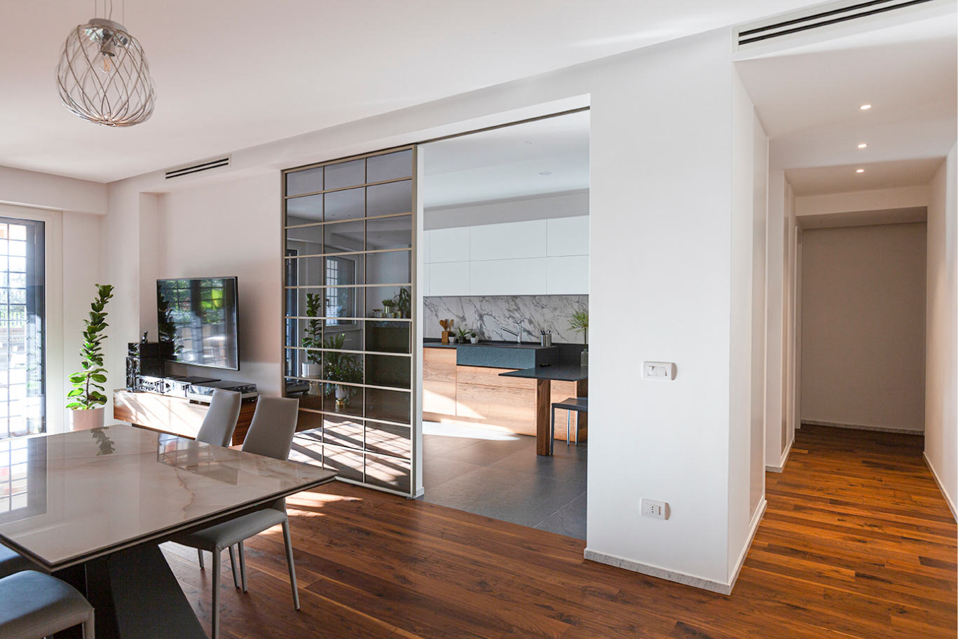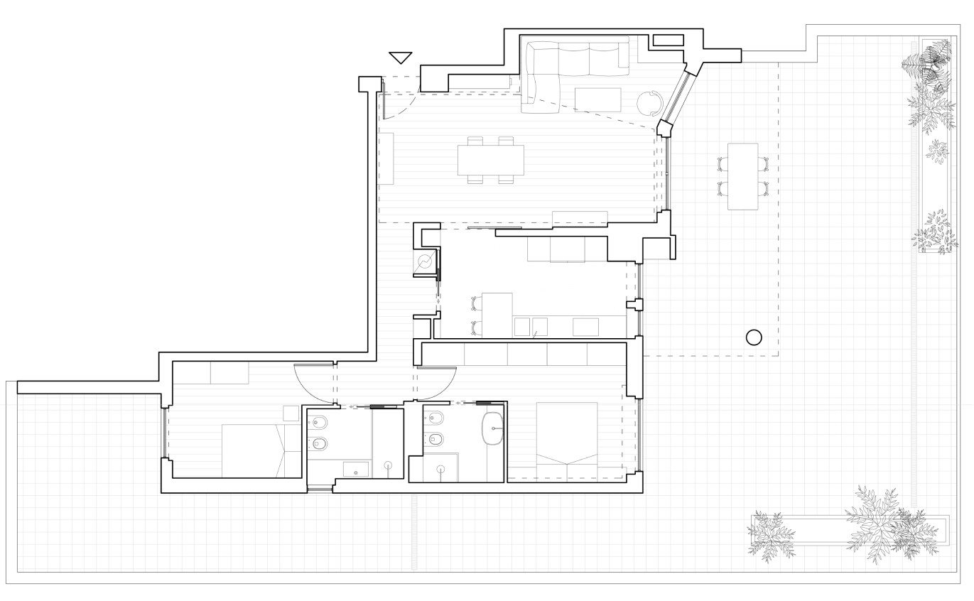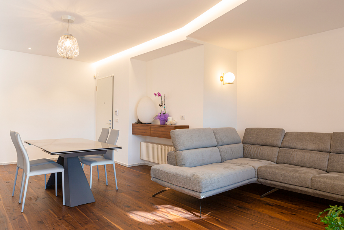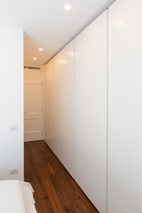 L’appartamento di recente costruzione, con delle linee ispirate all’architettura organica romana, ha subito un restyling stilistico finalizzato alla valorizzazione di alcune scelte architettoniche dei progettisti del fabbricato e ad un aggiornamento d’uso delle zone giorno e notte