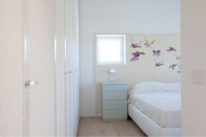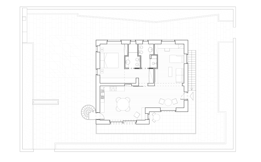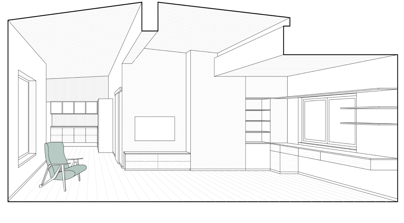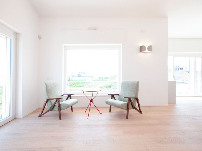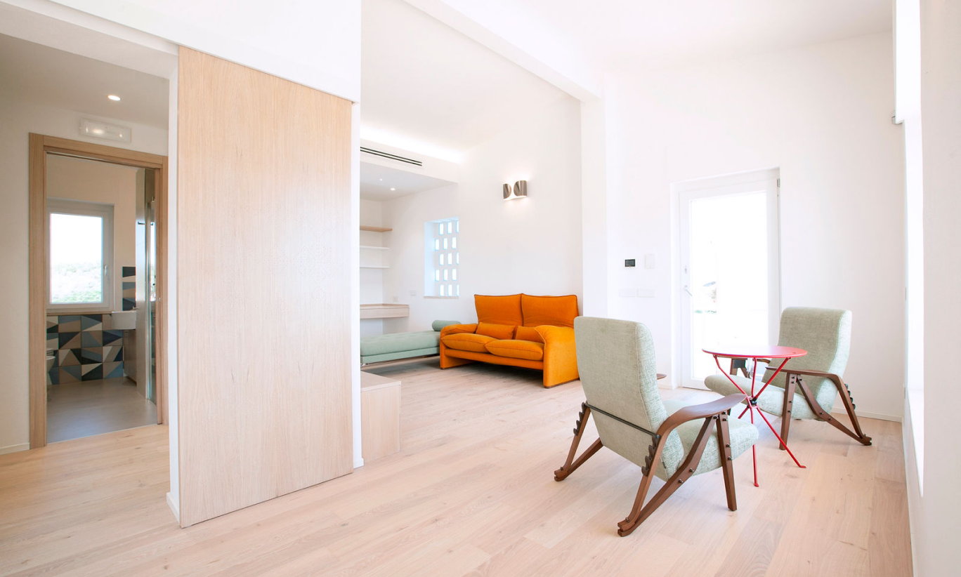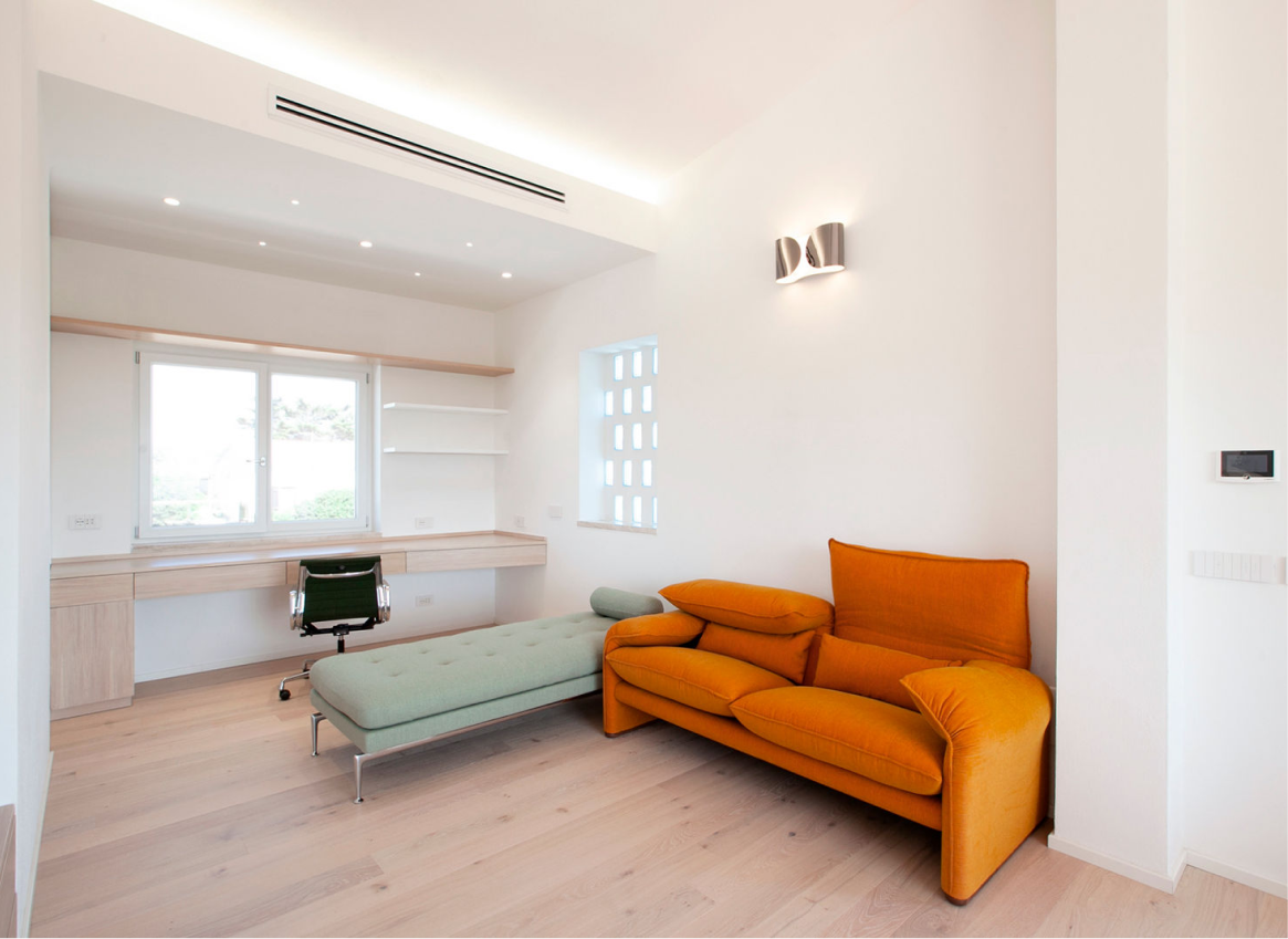 Nella ristrutturazione, che ha comportato drastiche modifiche per l’adeguamento alla nuova destinazione d’uso, come l’apertura di nuove finestre e vetrate, si è usato un registro stilistico simile a quello della costruzione negli anni ’60, sia nell’adozione di materiali e soluzioni estetiche sia nella scelta degli arredi di quel periodo
