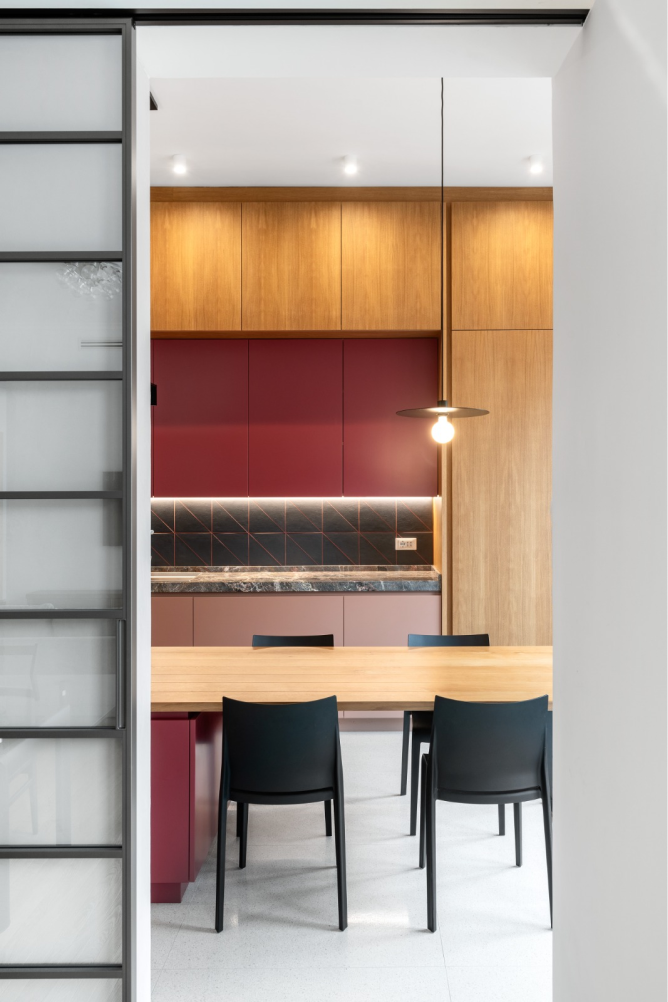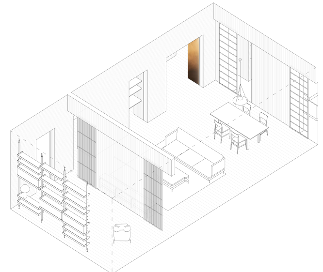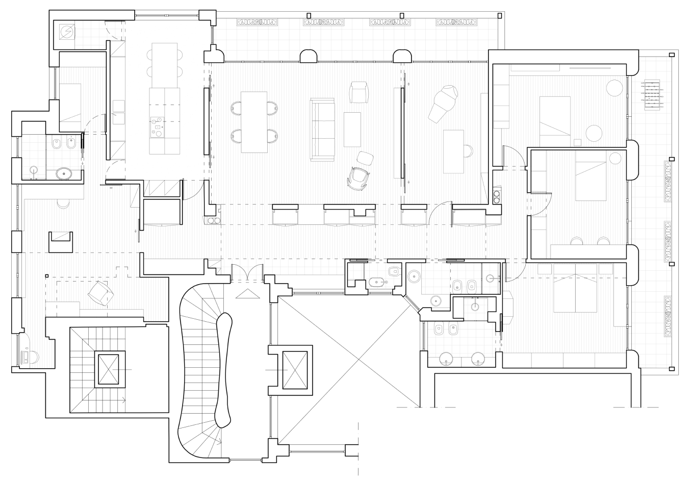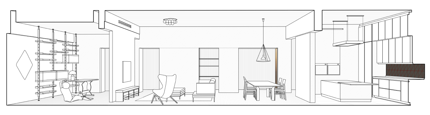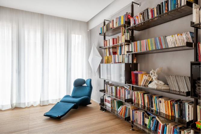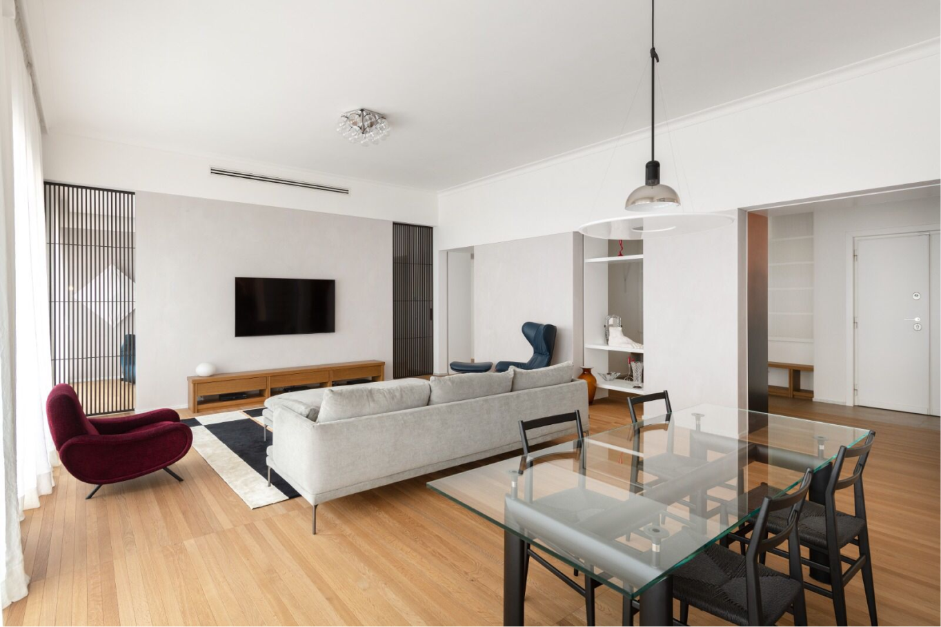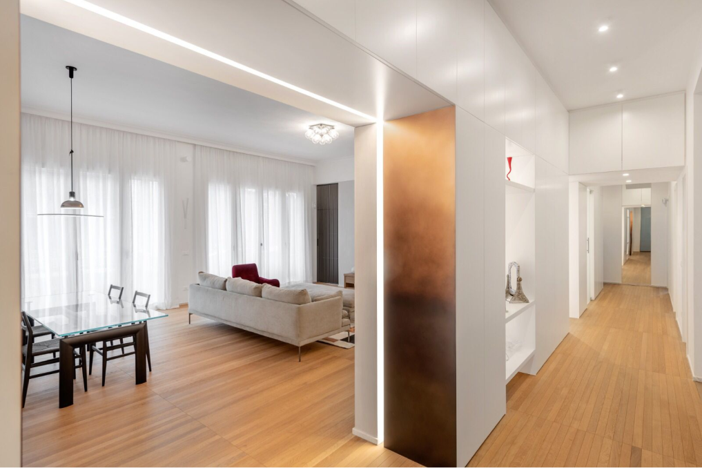 I tre ambienti del salone centrale, dello studio e della cucina vengono separati mediante l’utilizzo di grandi pannelli scorrevoli vetrati a contrasto con le pareti rivestite in grassello di calce, ma al tempo stesso una volta aperte le porte gli ambienti si uniscono in uno spazio fluido e ricercato
