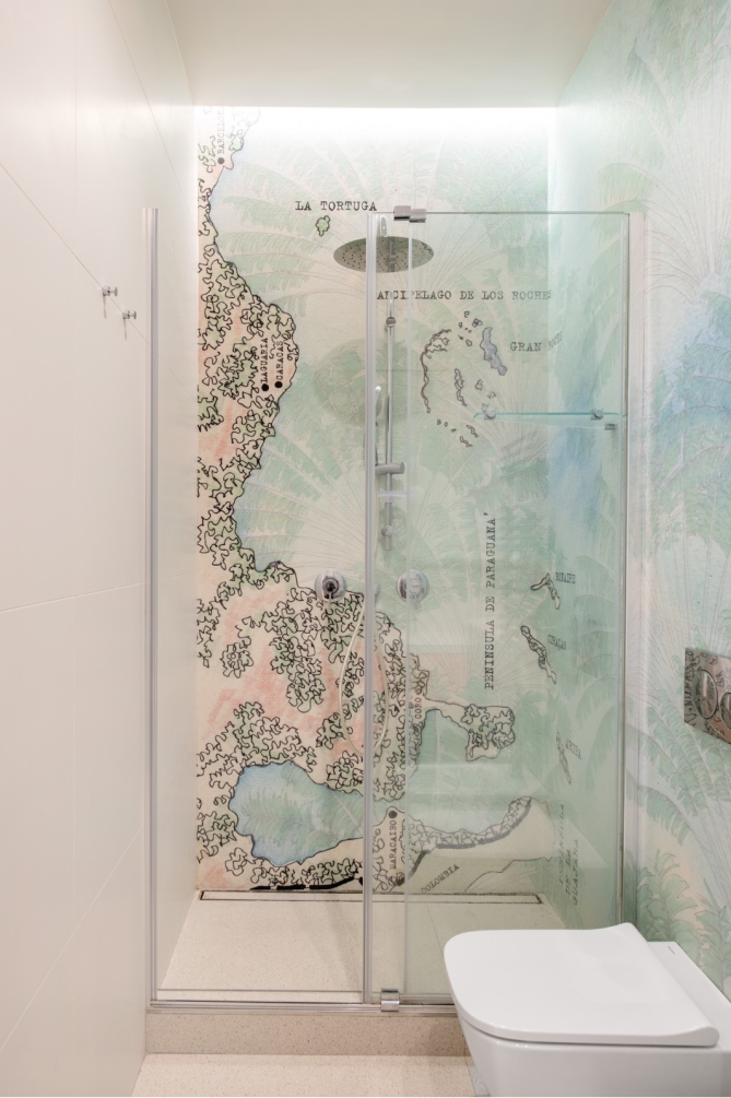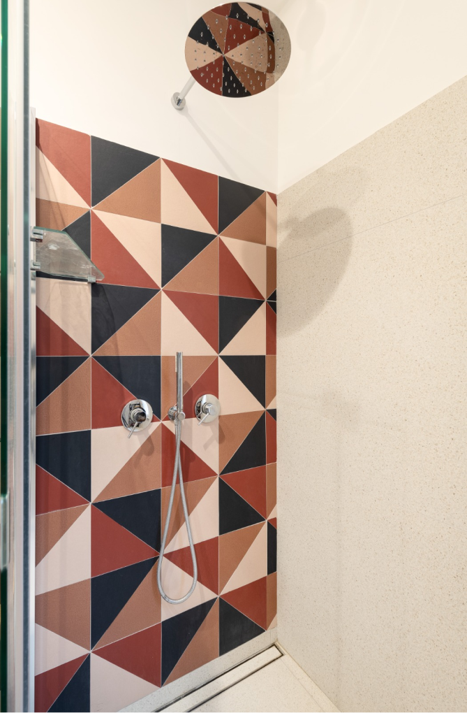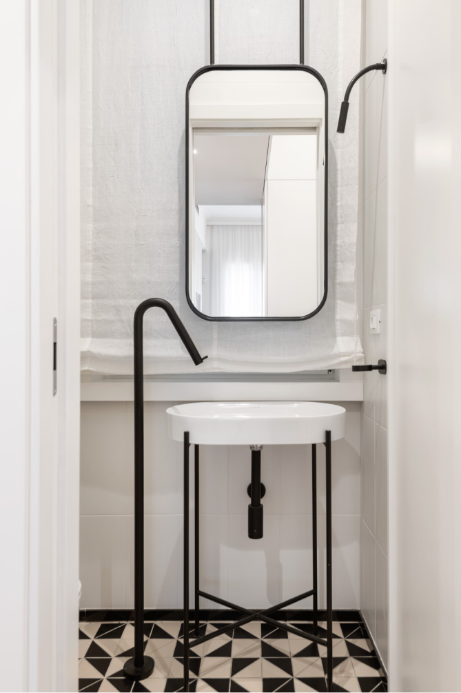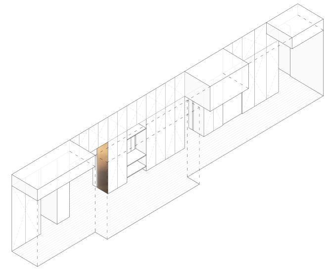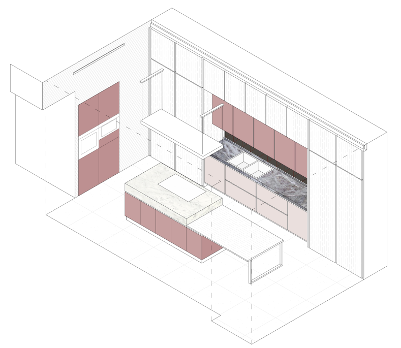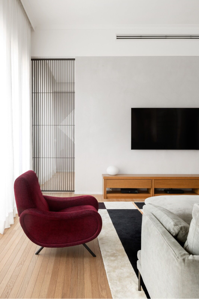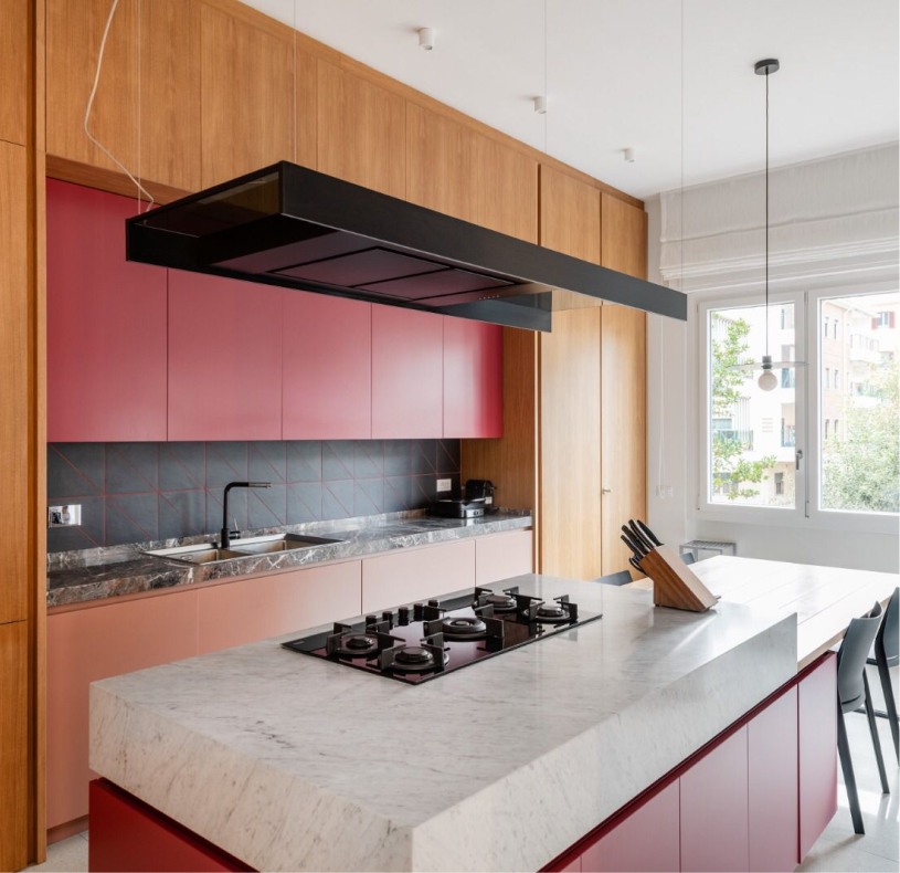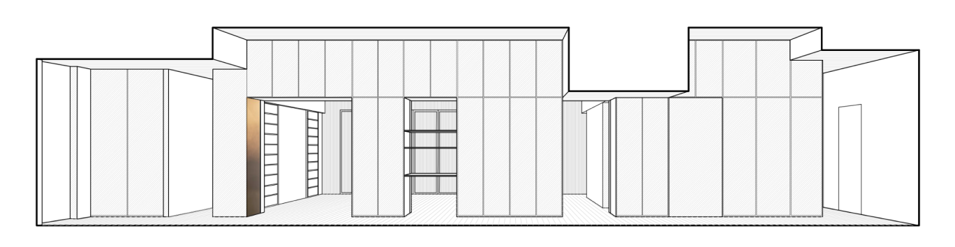 I tre ambienti del salone centrale, dello studio e della cucina vengono separati mediante l’utilizzo di grandi pannelli scorrevoli vetrati a contrasto con le pareti rivestite in grassello di calce, ma al tempo stesso una volta aperte le porte gli ambienti si uniscono in uno spazio fluido e ricercato