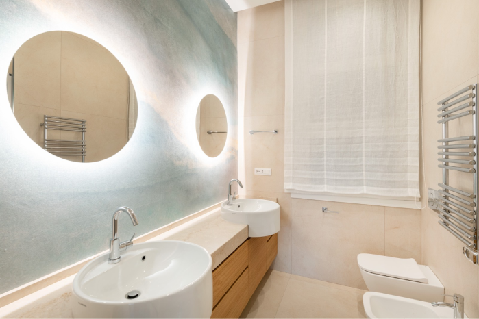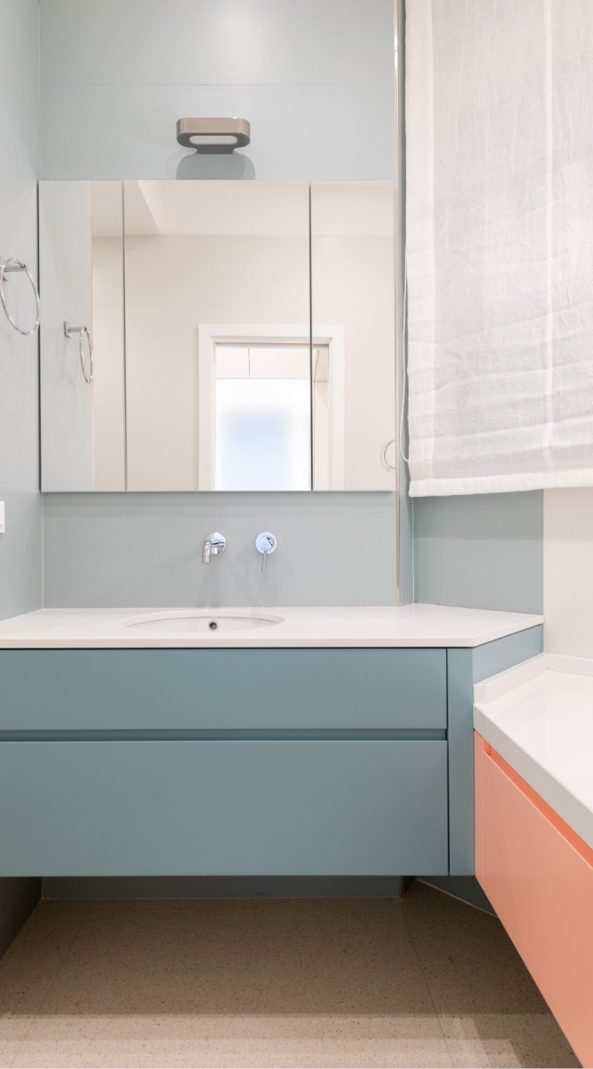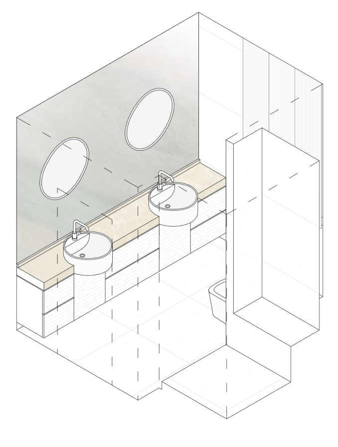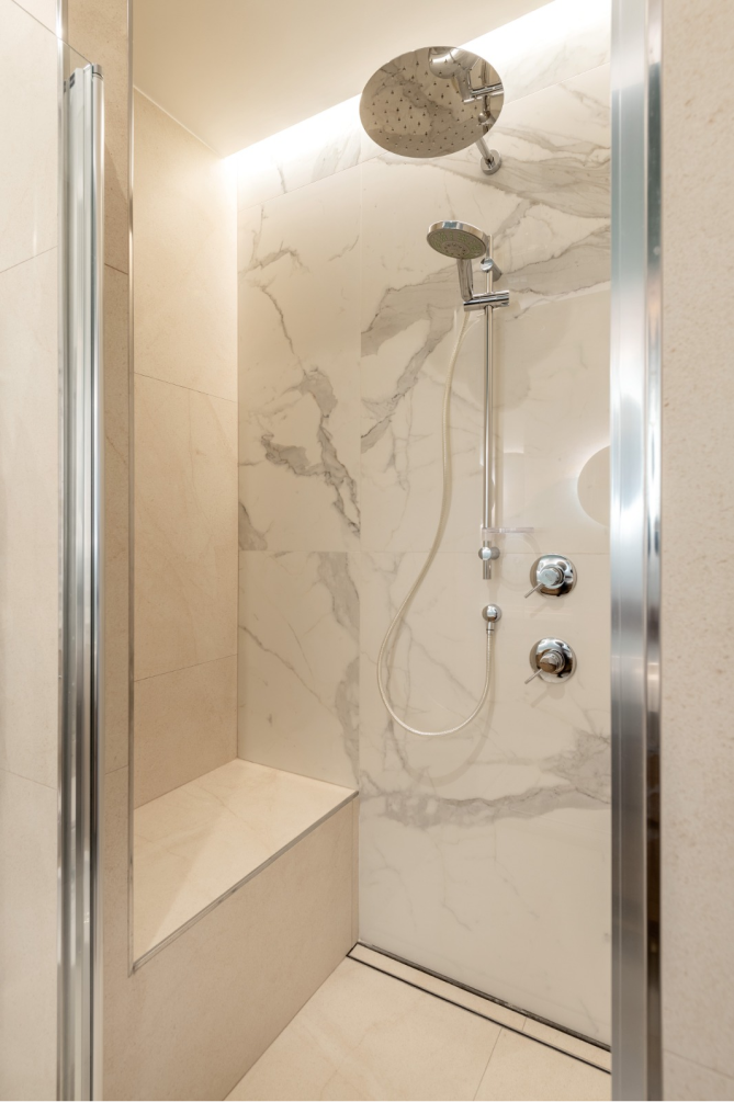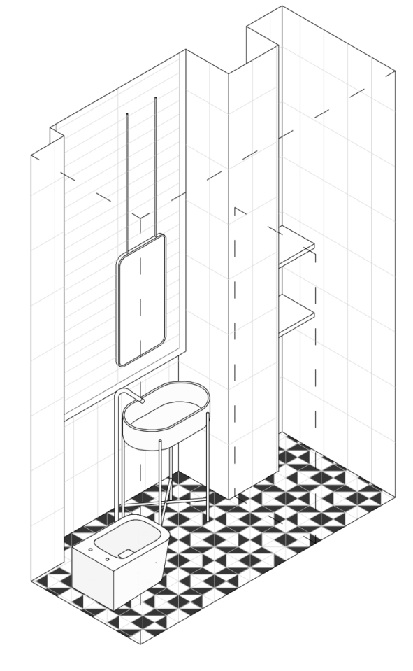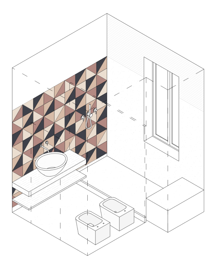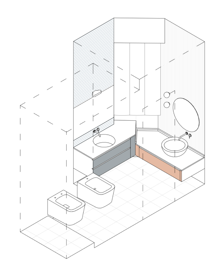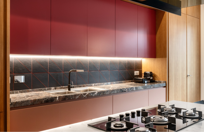I tre ambienti del salone centrale, dello studio e della cucina vengono separati mediante l’utilizzo di grandi pannelli scorrevoli vetrati a contrasto con le pareti rivestite in grassello di calce, ma al tempo stesso una volta aperte le porte gli ambienti si uniscono in uno spazio fluido e ricercato
